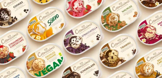 人類對色彩的敏感度與生俱來,而冰淇淋包裝深諳此道。紅橙黃綠藍紫的極致演繹,不僅是視覺的狂歡,更是心理學的精準拿捏。紅色點燃熱情,黃色喚醒食欲,藍色傳遞清爽,粉色誘發甜蜜聯想,將天然風味的熱情與清新的植物性成分相結合。利用調色板來反映味道的新鮮和刺激。這些色彩將抽象的口味轉化為直觀的情緒信號,讓消費者在 0.2 秒內完成心動、識別、購買的決策鏈。更妙的是,高飽和色調在冰柜中形成強烈的視覺突圍,即使隔著玻璃也能瞬間抓住眼球,堪稱行走的廣告牌。