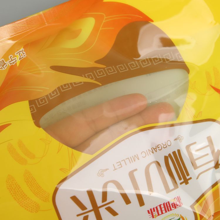 | 附加功能 | 黃小米包裝袋頂端帶有扣手,背封效果 |