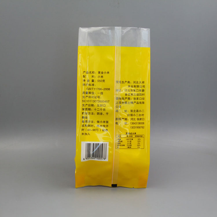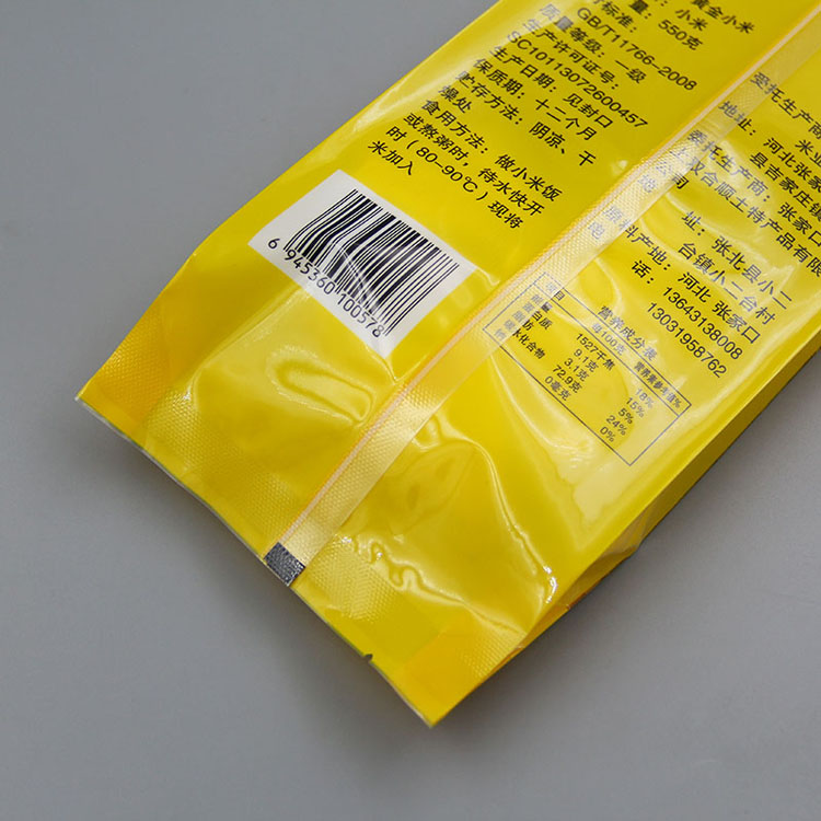 | 附加功能 | 黃小米包裝袋頂端帶有扣手,背封效果 |
