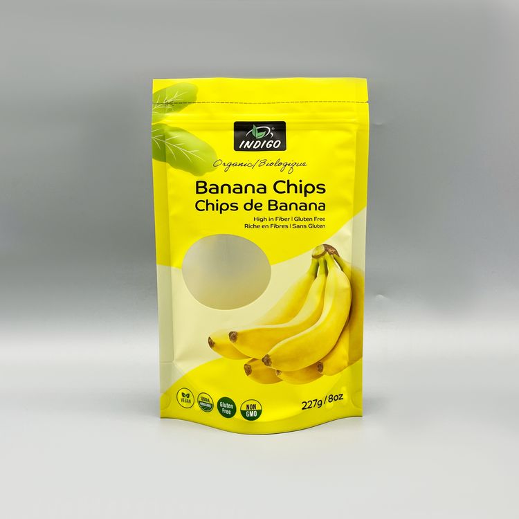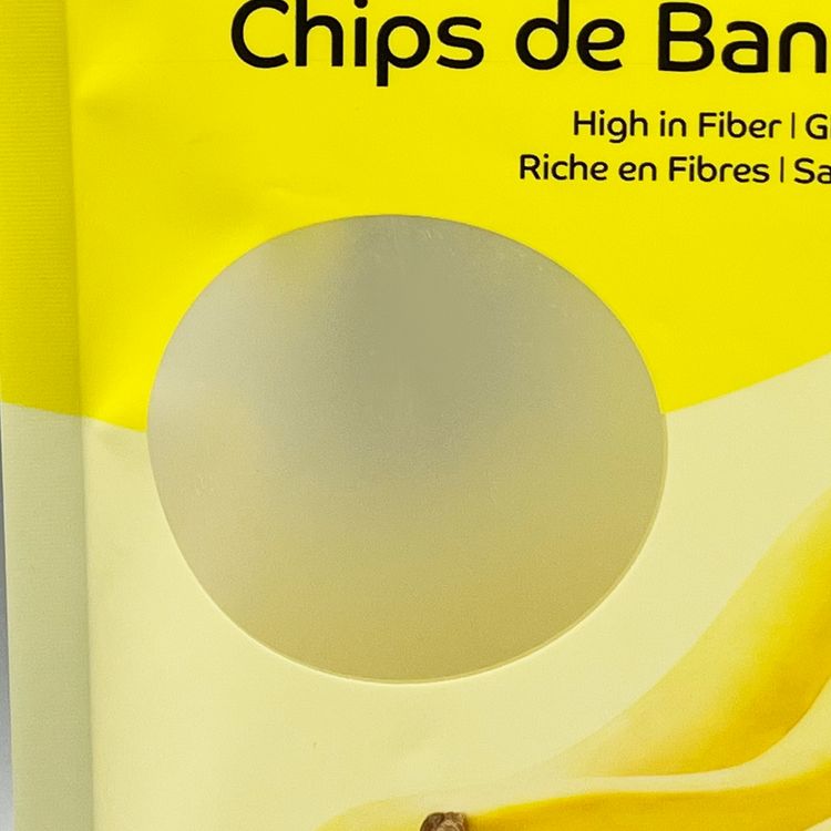 圓形透明開窗直觀呈現金黃香蕉片形態與品質,增強消費信任感,
